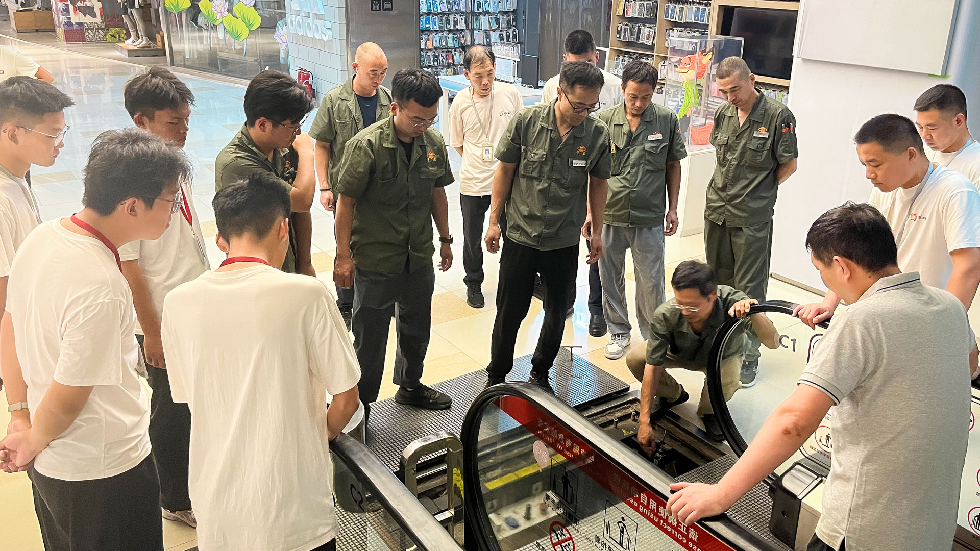 在電梯安全培訓(xùn)環(huán)節(jié),水電維修中心電梯維保負(fù)責(zé)人聚焦廣場電梯日常運(yùn)維中的高頻問題,包括梳齒板異常、防夾裝置觸發(fā)等故障代碼識別與常見故障解析。建議大家在報(bào)修時(shí)同步提供故障代碼,以提升維修效率。現(xiàn)場更是向大家演示了直扶梯的盤車操作、平層定位等關(guān)鍵技能,重點(diǎn)強(qiáng)調(diào)了“斷電優(yōu)先”的原則,整體強(qiáng)化了參訓(xùn)人員的故障判斷與應(yīng)急處理能力。